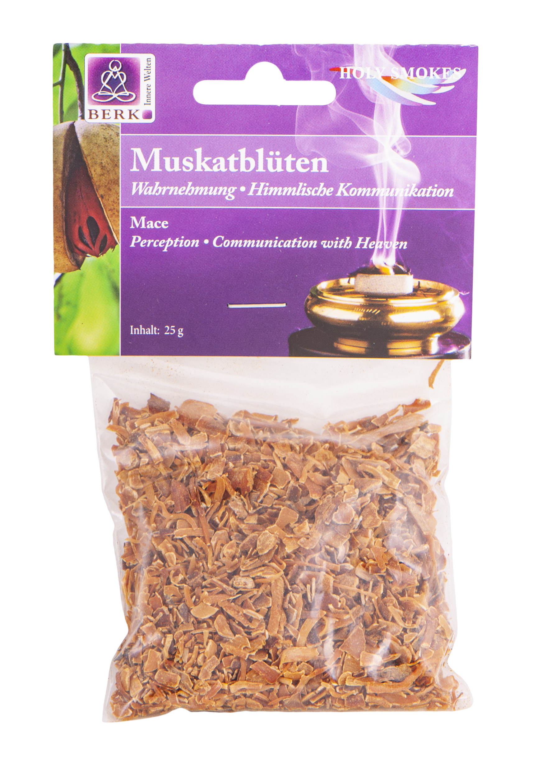Gehören zu den magischen Pflanzen und besitzen bewusstseinserweiternde, klarsichtige, visionäre Eigenschaften. Muskatblüten werden beim Räuchern nur sparsam und meist in Mischungen mit anderen Pflanzen angewendet. Sie eignen sich hervorragend für Orakel und Visionsräucherungen.