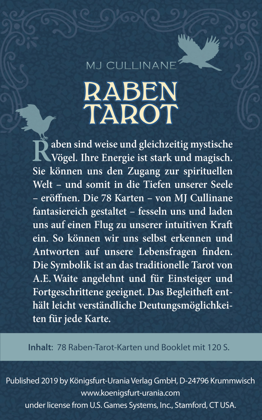 Die 78 Karten – von MJ Culliane fantasiereich gestaltet – fesseln uns und laden uns auf einen Flug zu unserer intuitiven Kraft ein. So können wir uns selbst erkennen und Antworten auf unsere Lebensfragen finden. Die Symbolik ist an das traditionelle Tarot von A.E. Waite angelehnt und für Einsteiger und Fortgeschrittene geeignet. Das Begleitheft enthält leicht verständliche Deutungsmöglichkeiten für jede Karte.