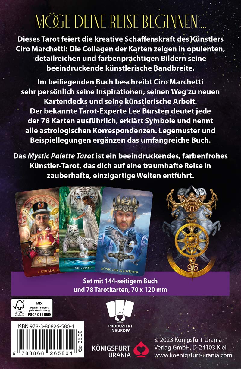 Das Mystic Palette Tarot hatte der Digital-Artist Ciro Marchetti ursprünglich für eine kleine, exklusive Ausgabe erschaffen, die nur über seine Homepage bei ihm selbst zu erwerben sein sollte. Es kostete viel Überredungskraft, das Deck schließlich dem Königsfurt-Urania Verlag für eine deutsche Ausgabe für den Handel freizugeben.