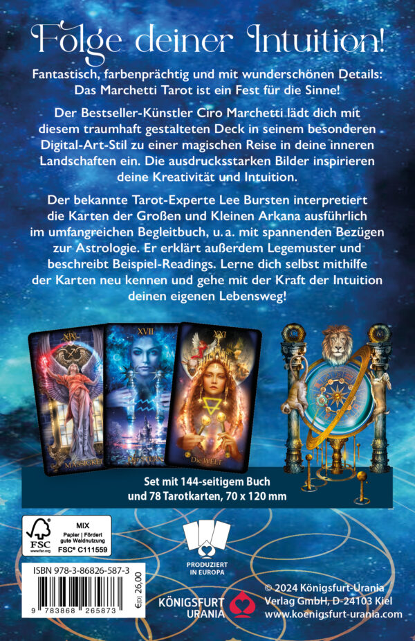 Das Marchetti Tarot ist ein Fest für die Sinne! Der Bestseller-Künstler Ciro Marchetti lädt dich mit diesem traumhaft gestalteten Deck in seinem besonderen Digital-Art-Stil zu einer magischen Reise in deine inneren Landschaften ein. Die ausdrucksstarken Bilder inspirieren deine Kreativität und Intuition.
